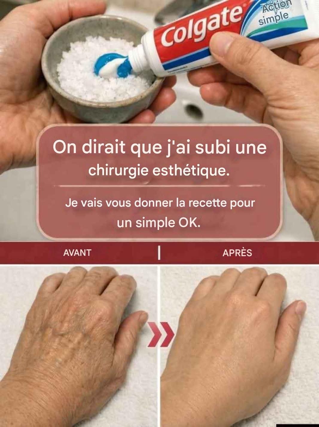 Beaucoup de personnes sont surprises d’apprendre qu’un produit ménager aussi simple que le dentifrice peut contribuer à atténuer l’apparence des taches de vieillesse, des rides et autres signes de vieillissement sur les mains et les bras. Bien qu’il ne s’agisse pas d’un substitut miracle aux traitements professionnels, le dentifrice possède des propriétés qui peuvent illuminer le teint et lisser les ridules lorsqu’il est utilisé correctement. Pourquoi le dentifrice agit-il sur la peau ? Le dentifrice contient des ingrédients tels que : bicarbonate de soude, fluorure, abrasifs doux et composés antibactériens. Ces composants peuvent aider à exfolier les cellules mortes, à atténuer les taches pigmentaires et à améliorer le grain de peau. Remède maison étape par étape : Ingrédients : une petite quantité de dentifrice blanc nature. Facultatif : quelques gouttes de jus de citron (pour un effet éclaircissant renforcé). Instructions